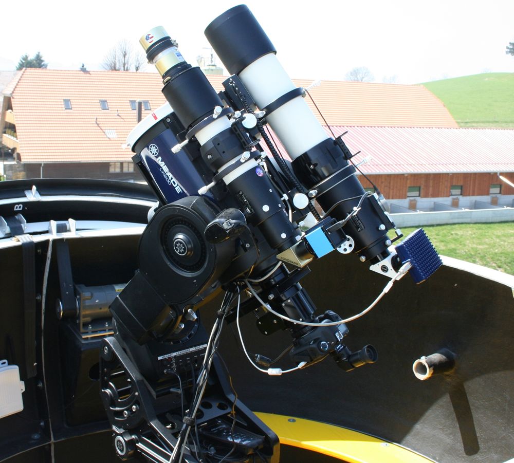 Patrick Enderli stellte sein "gerade noch mobiles" Instrumentarium im Garten der Sternwarte Uecht auf. Auf der grossen Montierung waren seine drei beindruckenden Teleskope montiert für die unterschiedlichen Wellenlängen "Weisslicht", "H-Alpha" und "Ca II K". Um 13:00 Uhr wurde die Sternwarte dann für die Besucher geöffnet, worauf sie sich gleich daran machten die weisse, rote und tief violette Sonne zu bestaunen. Zwischenzeitlich wurden die Teleskope regelrecht belagert und eine Frage nach der anderen gestellt. Auch das Teleskop für Weisslicht von Martin Mutti wurde rege beansprucht, der sich gleich nebenan postiert hatte.