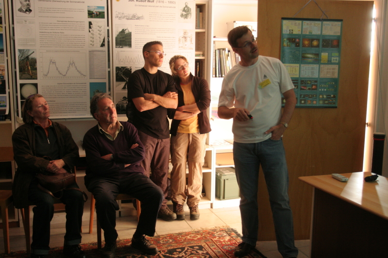 Vom benachbarten Sonnenturm, der ebenfalls mit Teleskopen für die drei unterschiedlichen Wellenlängen bestückt war, kamen die Live-Bilder der Sonne per Internet Funkverbindung direkt in den Vortragsraum der Sternwarte Uecht, wo sie per Video-Beamer an die Wand projiziert wurden. Dr. Thomas K. Friedli stellte sich dort dem Besucherstrom und hielt praktisch ohne Unterbruch einen Vortrag nach dem anderen. Die meisten Besucher konnten sich denn auch kaum mehr von den überaus interessanten Ausführungen losreissen und wollten den Raum kaum mehr verlassen.